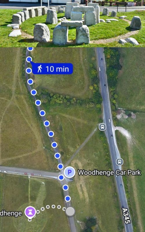 Het is maar een idee, heb het NOOIT gedaan, want over de Stonehenge site lopen naar de Durrington Walls en Woodhenge maakt veel meer indruk, maar je kunt ook met de auto bij de Durrington Walls en Woodhenge komen: vanaf de Parkeerplaats bij het bezoekerscentrum naar de A303 rijden, daar linksaf en dan bij de eerstvolgende rotonde naar links, tot de volgende rotonde, bij wat restaurants, heb daar een keer wat gegeten, was prima en vervolgens de Madurodam versie van de Stonehenge steencirkel bekeken.